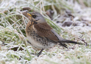 The grey-headed, chestnut-backed Fieldfare is the largest of the thrushes, and visits Britain & Ireland during the winter months.