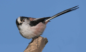 Long-tailed Tits live up to their name, with tails that are noticeably longer than their bodies. They have pale underparts contrasting with darker wings and tail, distinctive black stripes on an otherwise white head, and blush pink on the breast, wings and eye-ring. Long-tailed Tits typically lay a single clutch of eggs in March and April in a beautifully intricate domed nest, constructed of lichen and cobwebs, and lined with up to 1,500 feathers. This species has a co-operative breeding strategy, with younger birds helping breeding pairs to rear chicks. Males and females look alike.