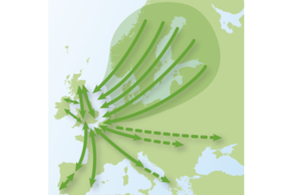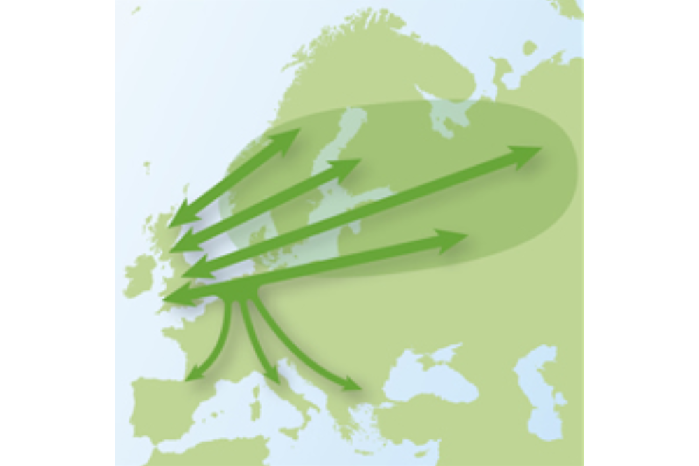 The map shows the movement of Starlings from a broad geographical area into Britain and Ireland.