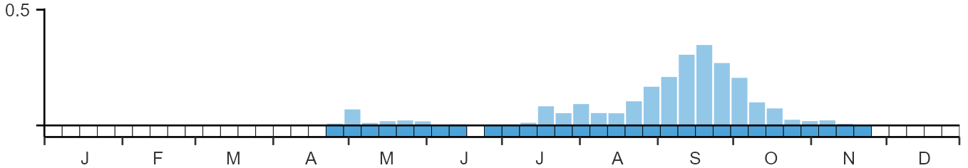 Pectoral Sandpiper is a rare but regular vagrant, with two clear pulses of birds arriving in autumn; comparatively rare on spring passage.