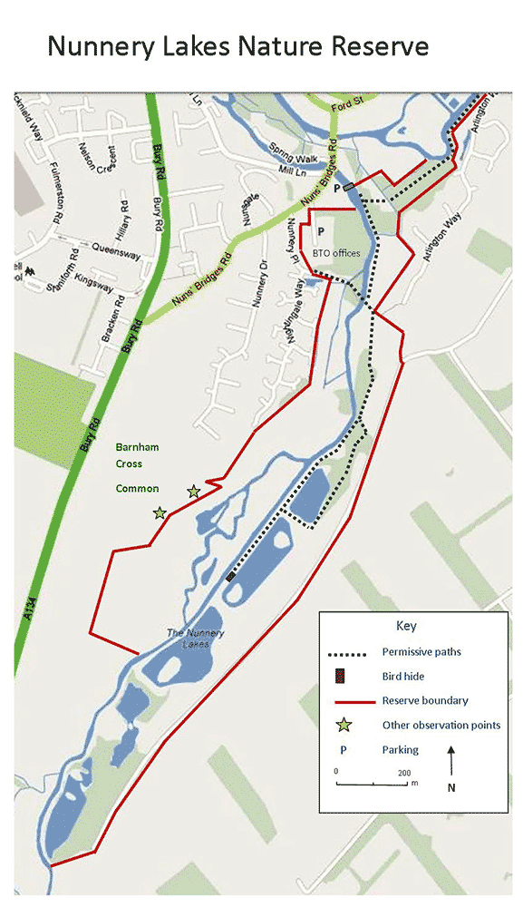 From the car park at the BTO, Nunnery Place leads to a track to the river, and beyond the bridge, the kissing gate to the lakes is on the right.