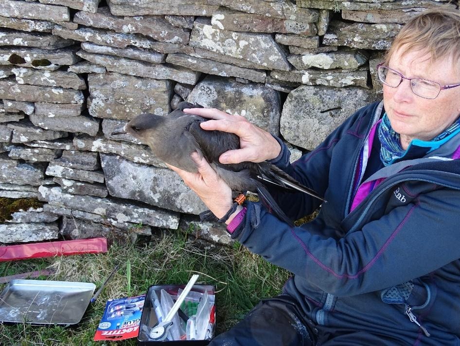Helen holding an adult bird ready for release. The geolocator is attached to the uniquely-coded orange ring on the Arctic Skua’s left leg. Liz Humphreys from BTO Scotland contacted us in 2018, having heard about our well-established study. BTO’s scientists were keen to use geolocators to track the adult Arctic Skuas, to find out where they spent their winters, and to learn more about their migration routes. This information would help inform conservation efforts to protect this species. The work on Rousay would build on the study of Fair Isle breeding Arctic Skuas, which BTO began in 2017, and offer a comparator site. Fair Isle is roughly 30 miles from Orkney.