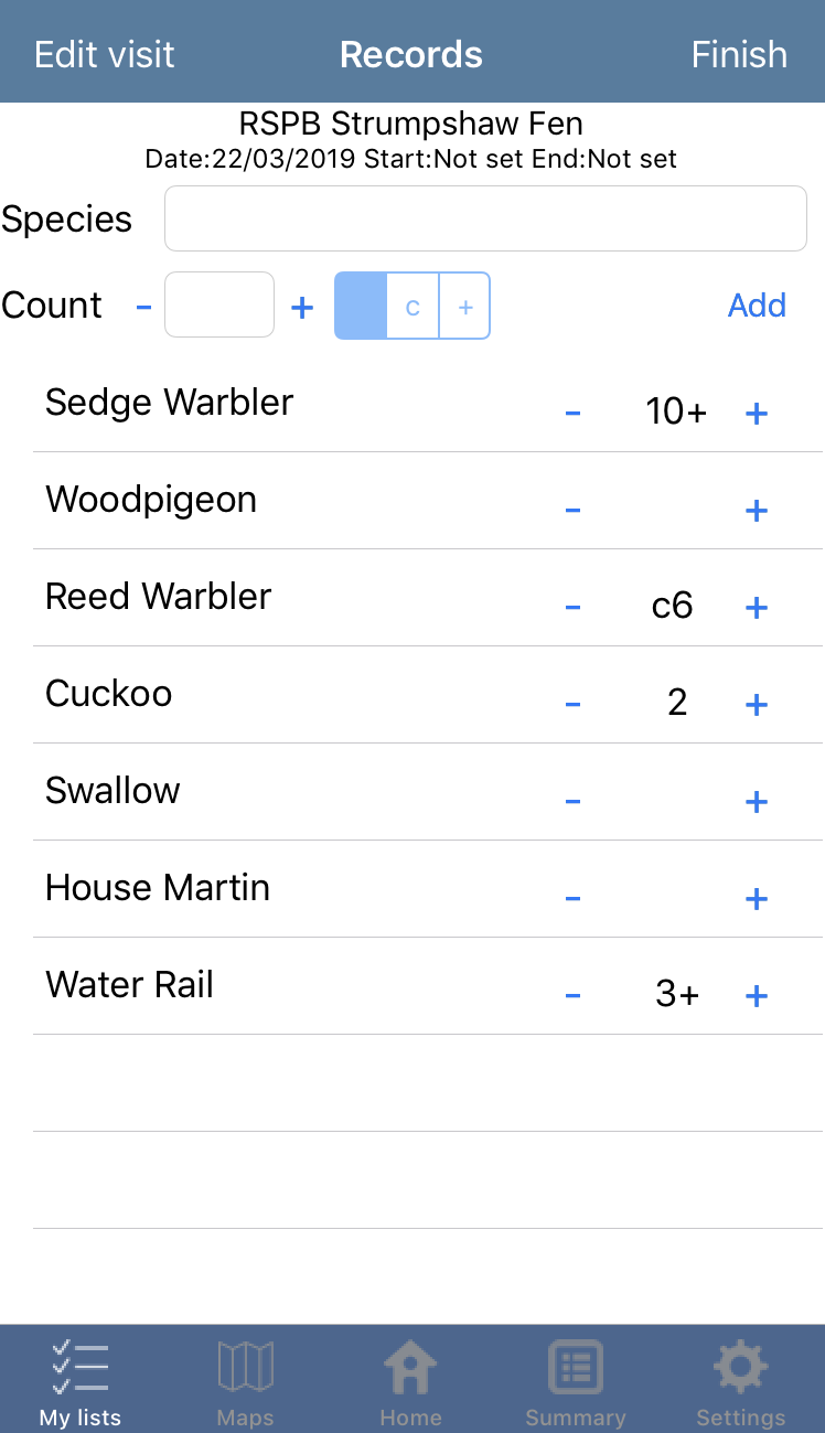 - Simple +/-/circa buttons to easily add and modify counts while you're out birding