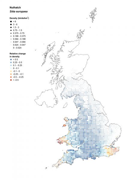 Nuthatch has a south-westerly distribution, being particularly abundant in deciduous woodlands of southern and western England, and Wales. It has increased widely, and is become more common in northern and eastern England, and southern Scotland, although with a hint of decline in Kent.