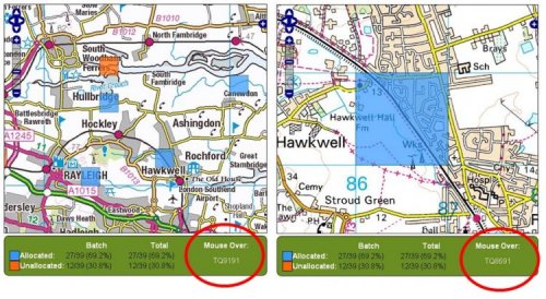 Clicking the blue 'plus' botton will bring up the option to change to an Ordnance Survey background. You can then zoom in on the map to show locations of allocated and unallocated squares. If you move the cursor over a sqyare the grid refernce will be displayed below the bottom right of the map
