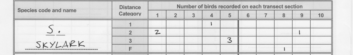 - Transfer the number of individual birds recorded in each 200-m transect section (1 – 10), in each distance band, for each species. You will need to add up the counts of the same species, distance band and transect section.