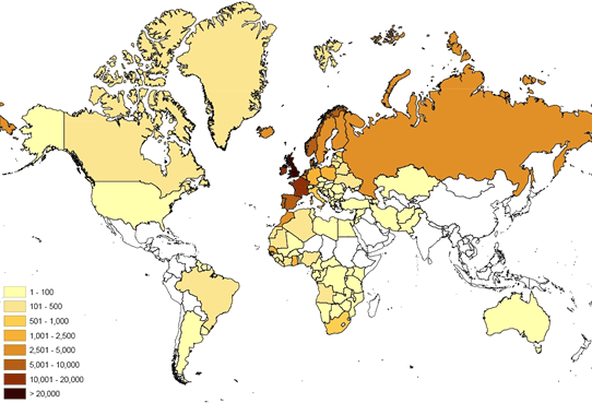 Many of our birds are pretty much resident, but some regularly migrate huge distances. These maps show where birds ringed in Britain and Ireland have been found since ringing began in 1909. The darker colours on the first map show where most birds have been found. The second shows the locations of all birds, with some of the most exceptional movements highlighted.