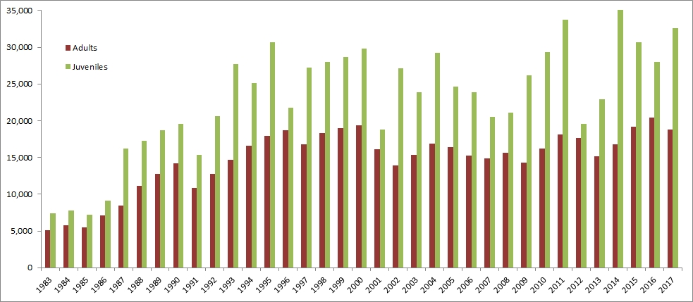 Adult Juvenile | 6,294 (36%) 11,079 (64%) | 347 (39%) 533 (61%) | 224 (28%) 580 (72%) | - | - | 6,865 (36%) 12,192 (64%) |