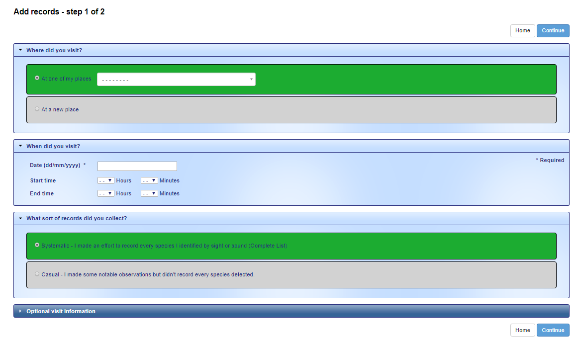 You can fill in the ‘optional visit information’ if you wish, this includes comments, weather notes and the type of count you made, such as seawatch, roost count or visible migration count. Once you have entered the information click ‘Continue’