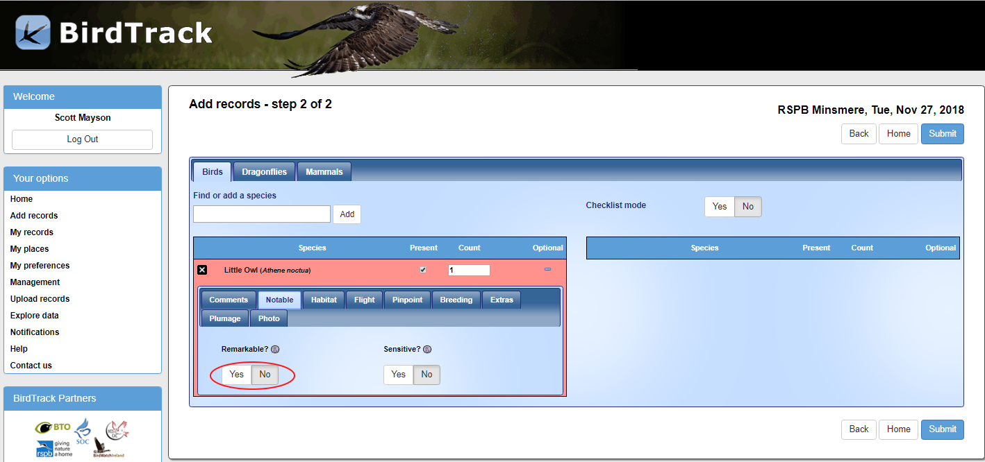 It is possible to mark such occurrences as remarkable when entering your records; these sightings will then appear in the 'Notable observations' page and also feature in the visit summary in the activity feed on the home page. To use this option, click on 'Optional' when entering your records online and then clicking on 'Notable'. All you need to do is click on 'Yes' under 'Remarkable'.