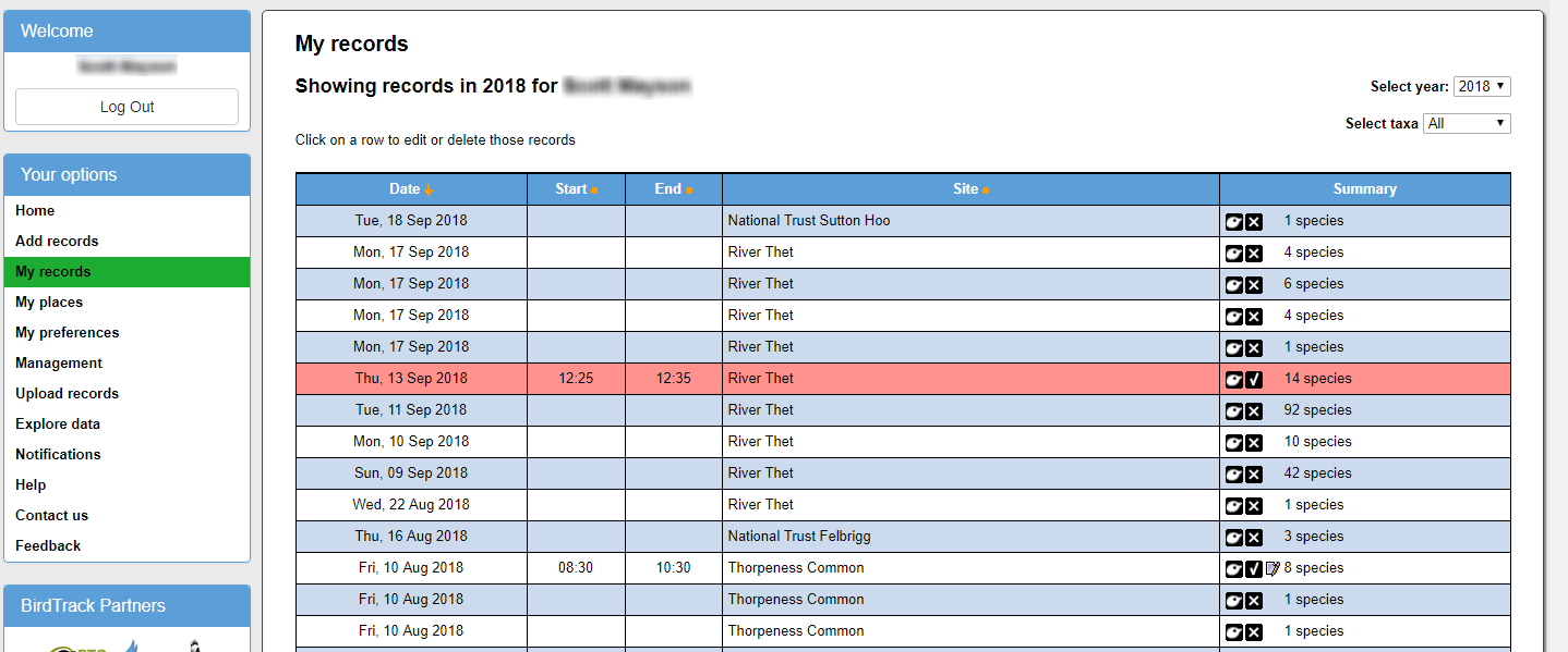 To view a record that you have entered, select ‘My records’ in the ‘Your Options’ menu on the left of the screen. This will open a new page where you can select the year for the record you wish to view using the drop down box next to ‘Select year’ at the top right of the screen. This will display a table for all the records submitted for that year in chronological order and show the date, start and end times of the visit if recorded, place name and a summary of the number of species seen. The icon showing a birds head, dragonfly or rabbit denotes the taxa recorded i.e. birds, odonata or mammals whilst the tick or cross symbol indicates if a complete list was made for that visit. The date order can be sorted from oldest to newest or from newest to oldest by clicking on the ‘Date’ header in the table.