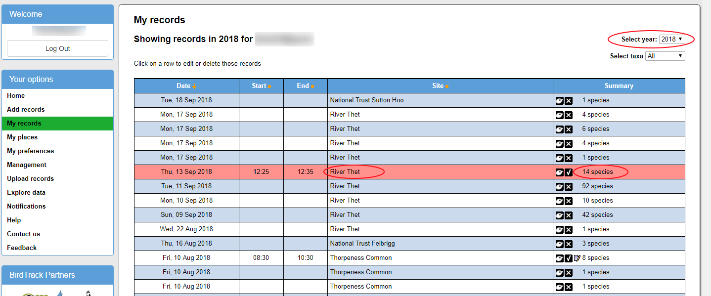 To edit a record select ‘My records’ in the ‘Your Options’ menu on the left of the screen. This will open a new page where you can select the year for the record you wish to edit. The date order can be sorted from oldest to newest or from newest to oldest by clicking on the ‘Date’ header in the table. Find the record you wish to edit, here you have 2 options to edit the record. Clicking on the place name for that entry will take you to the place entry details page that allow the visit details to be edited, whilst clicking on the species total under summary will enable you to edit the species information, such as counts and species recorded, for that visit.