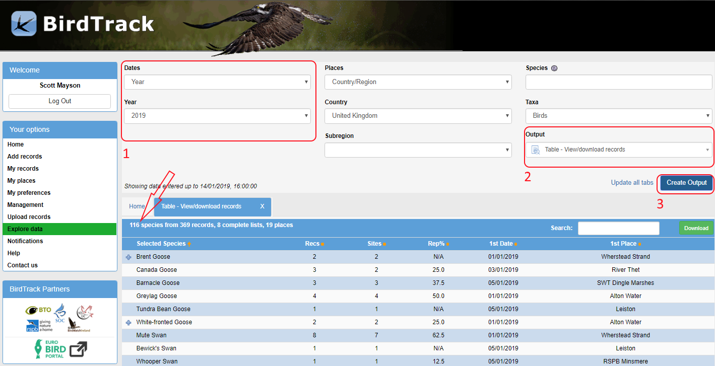 To view your year lists, select 'Year' from the ‘Dates’  filter (1). Next, use the dropdown menu from 'Years' to select the year  – the current year is the default setting. Once you have selected the appropriate year select 'Table-View/download records' from the 'Output' field (2) and click 'Create Output' (3) to display your life list in the table. The number of species recorded is shown at the top left of the table (red arrow).