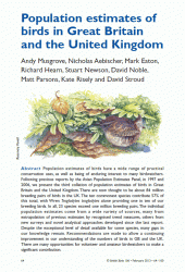 Unlike previous Britain & Ireland atlases we have not devised and published a new set of population estimates in Bird Atlas 2007–11. To some extent this is a recognition of the fact that Atlas data would form only part of any new estimates, with data from other surveys (e.g. Breeding Bird Survey, Countryside Bird Survey, Wetland Birds Survey, Irish Wetland Birds Survey) and schemes being at least as important. Furthermore, there are now separate mechanisms by which population estimates are produced in Britain and Ireland, with new figures being derived in Ireland as the Atlas went to press.