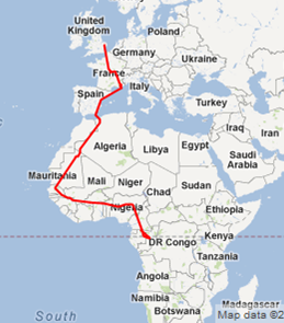 He started his migration back to Europe between the 10 and 18 of February, when we next heard from him in southern Cameroon, 450km north-west of his wintering location. At 19:02 on 22 February he was alive and the only subsequent message from the tag came at 07:57 on 25 February. There was no location information but the temperature sensor indicated that his body temperature had dropped from 36 to 22 degrees Centigrade, a sign that Clement was no more.