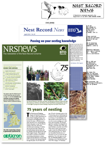 NRS News, also called Nest Record News, was started in 1984 by the late David Glue as the annual newsletter of the Nest Record Scheme. It ran for 31 editions and in 2015 was merged with the other Demography newsletters - Ringing News, CES News and RAS News -to form a single magazine, Life Cycle, for demographic monitoring volunteers.