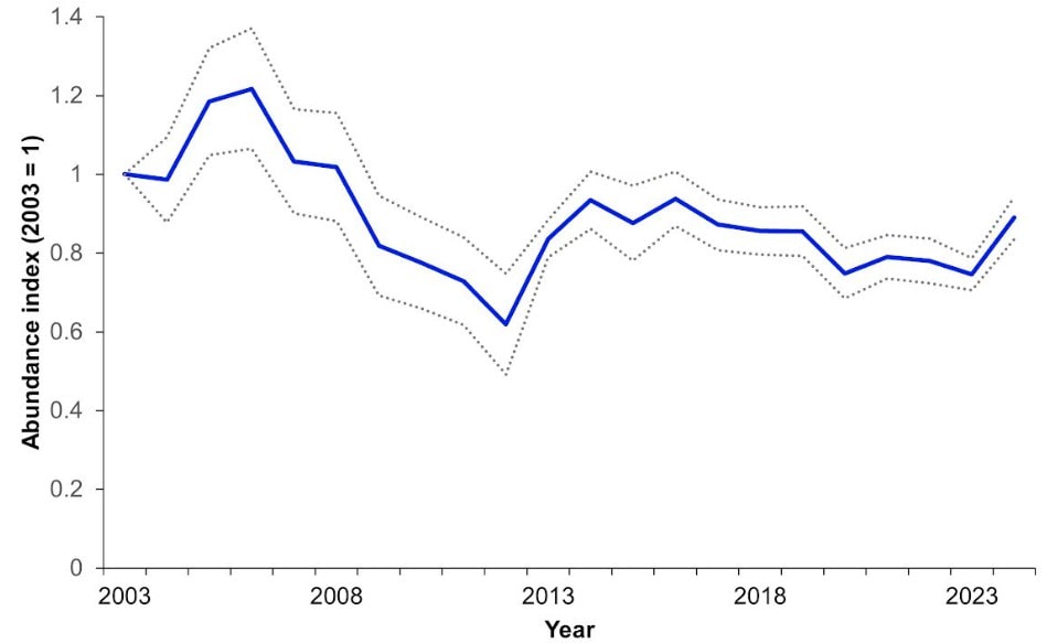 Fig. 1. Annual woodcock population index 2003-24 (grey dashed lines = 95% confidence limits).