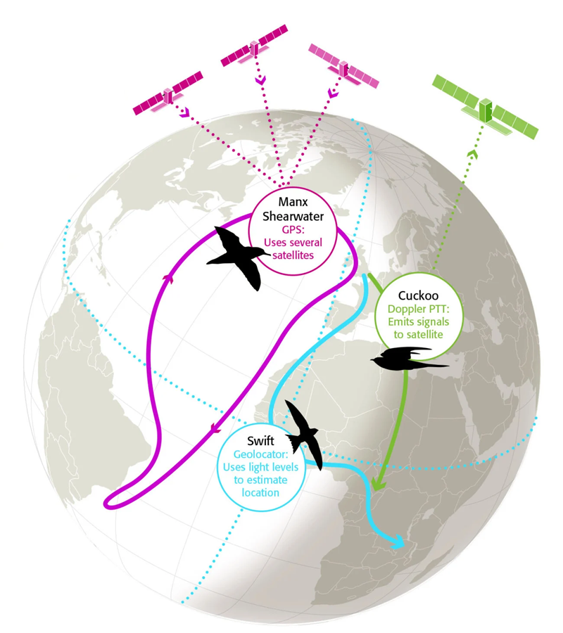 Geolocators, PPTs and GPS use different methods of calculating a bird’s position: geolocators use light levels to estimate location, Doppler PPTs emit a signal to a satellite, and GPS uses several satellites.