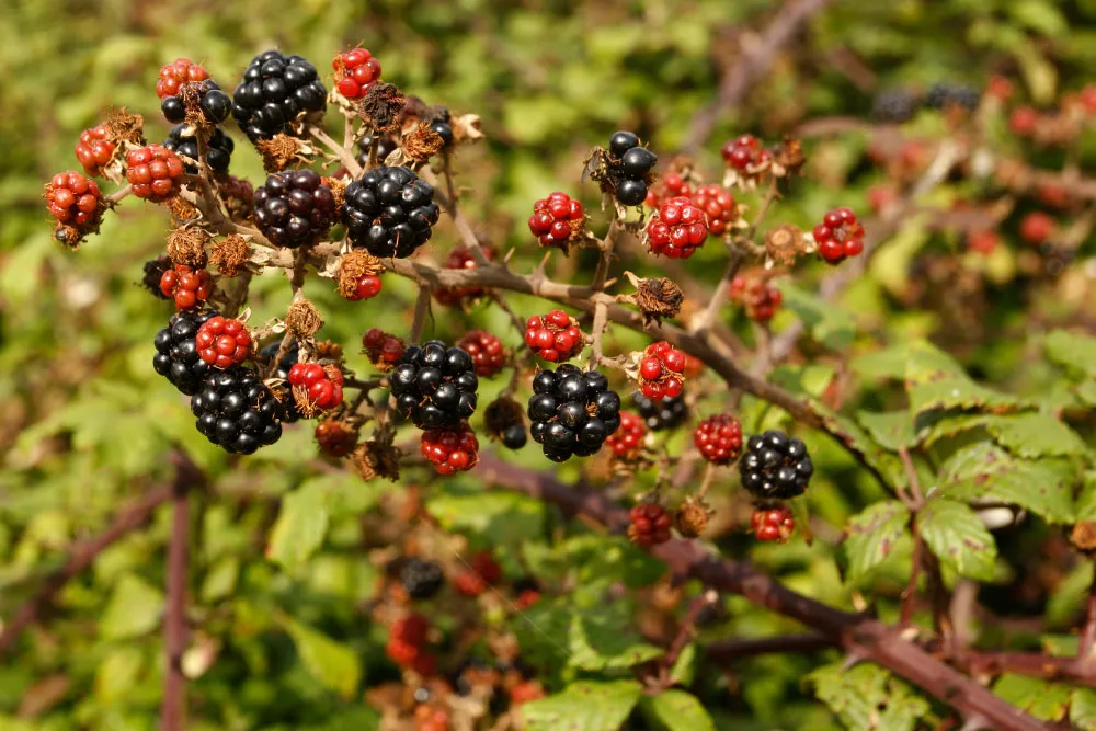 The fruits are green when unripe, changing to red and finally shiny black when fully ripe in late summer and autumn. Each fruit is made of many lobes and grows at the end of a short, thorny stem. There are more than 300 bramble species or microspecies in the UK, leading to many subtle differences in blackberry shape, size and taste.