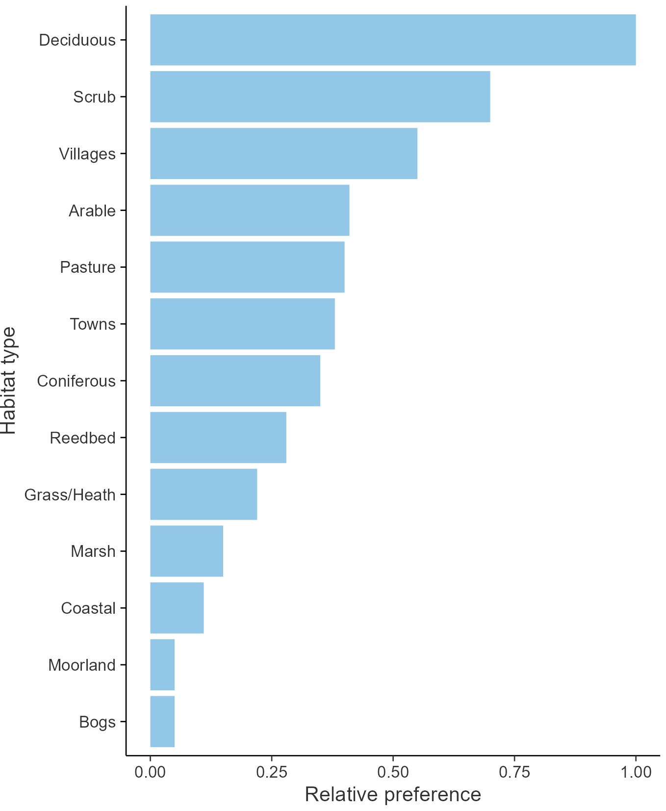 The graph shows the habitats occupied in the breeding season, with the most utilised habitats shown at the top. Bars of similar size indicate the species is equally likely to be recorded in those habitats.