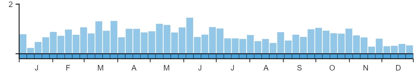 The graph shows when the species is present in the UK, with taller bars indicating a higher likelihood of encountering the species in appropriate regions and habitats.