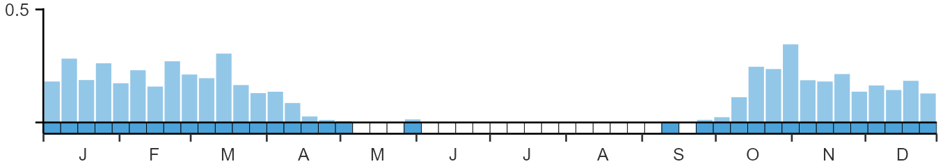 The graph shows when the species is present in the UK, with taller bars indicating a higher likelihood of encountering the species in appropriate regions and habitats.