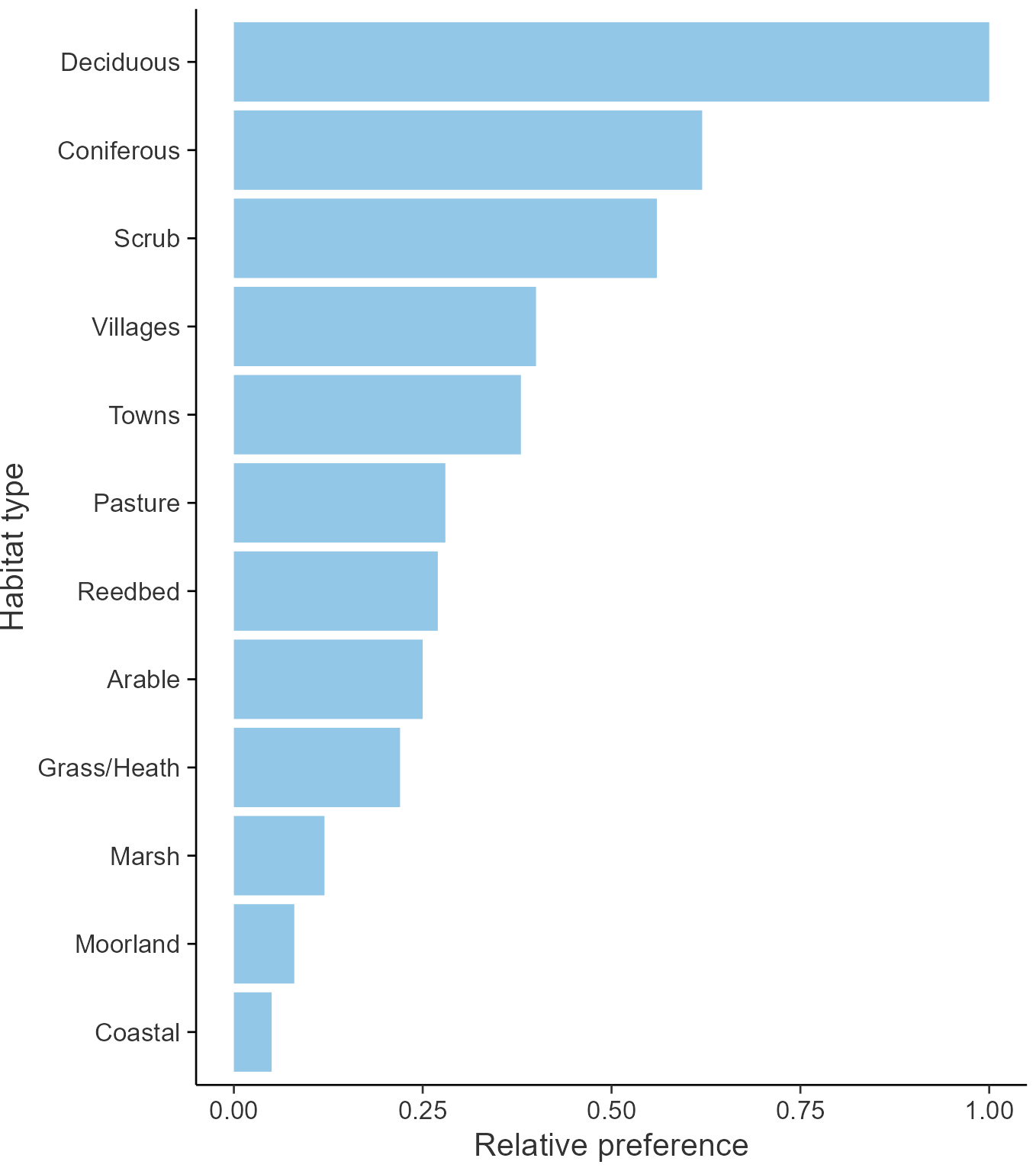 The graph shows the habitats occupied in the breeding season, with the most utilised habitats shown at the top. Bars of similar size indicate the species is equally likely to be recorded in those habitats.