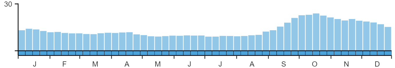 Jay is recorded throughout the year but detections peak in autumn when birds disperse or are actively seen caching food for the winter.