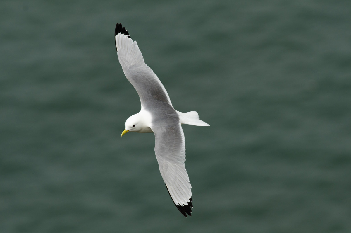 Breeding adults have a white head and body with a mid-grey mantle and wings. They also have distinctive, jet black 'ink-dipped' wing tips. Kittiwakes take three years to attain full adult plumage.