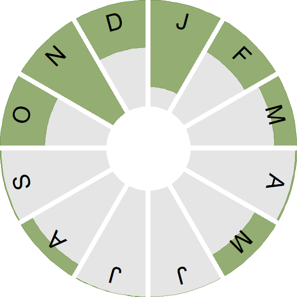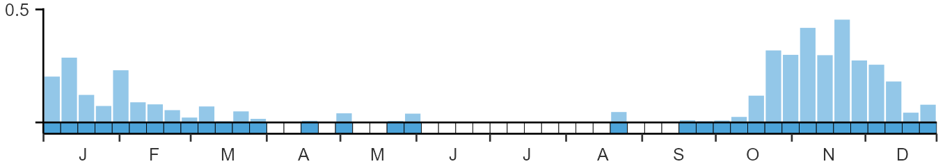 The graph shows when the species is present in the UK, with taller bars indicating a higher likelihood of encountering the species in appropriate regions and habitats.