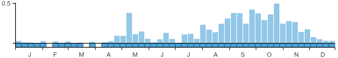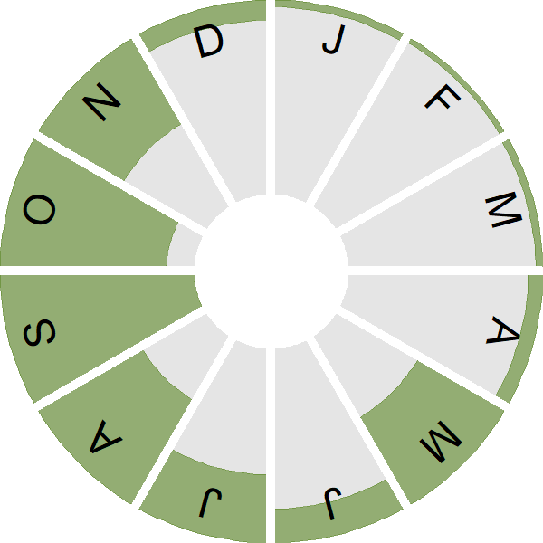 The graph shows when the species is present in the UK, with taller bars indicating a higher likelihood of encountering the species in appropriate regions and habitats.