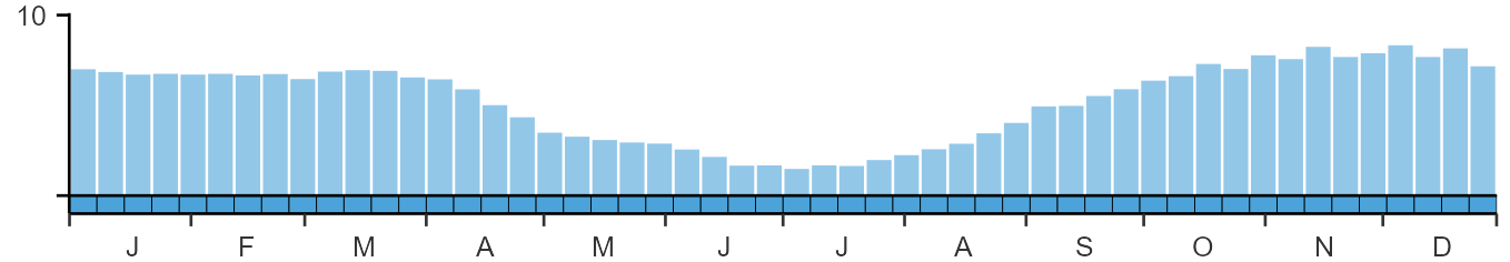 The graph shows when the species is present in the UK, with taller bars indicating a higher likelihood of encountering the species in appropriate regions and habitats.