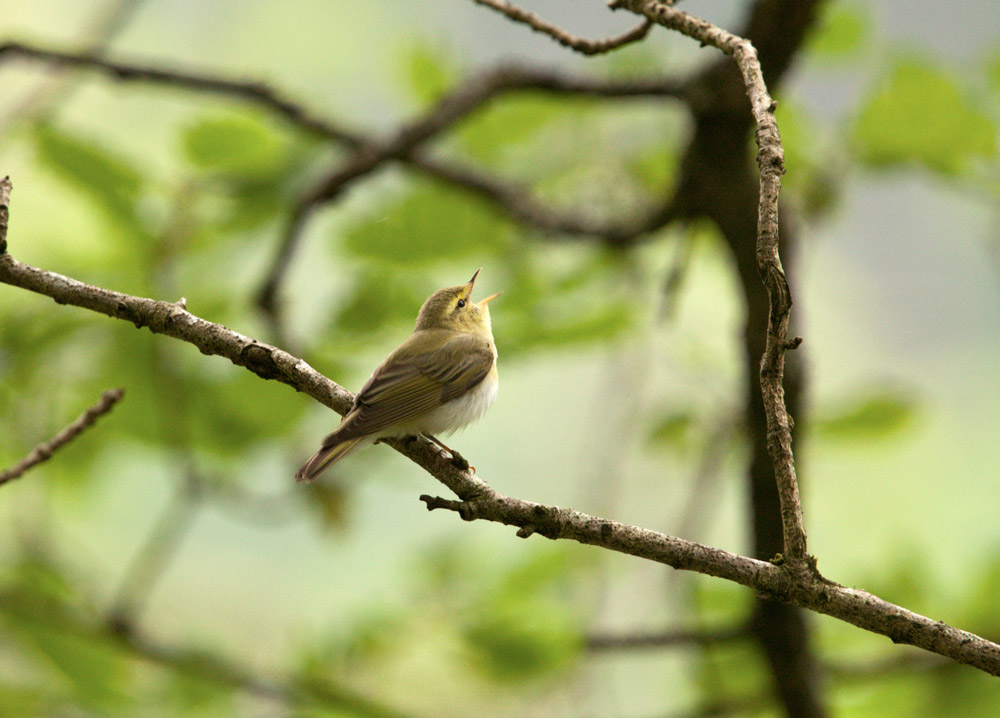 Very much a bird of western Oak woods, the Wood Warbler, with its yellow throat and silvery-white underparts is the least common of the UK's breeding leaf warblers.