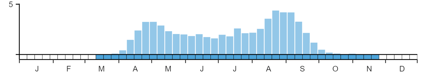 The graph shows when the species is present in the UK, with taller bars indicating a higher likelihood of encountering the species in appropriate regions and habitats.