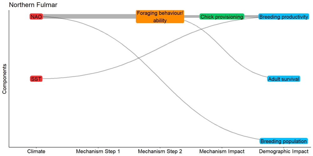 Responses to climate change differed between species. While long-ranging species such as Northern Fulmar were influenced by large-scale climatic factors, species with more restricted ranges such as Shag were more sensitive to localised weather conditions. Responses were also linked to foraging behaviour; surface-foragers such as Black-legged Kittiwake were most sensitive to variation in prey abundance, but diving species like Common Guillemot were more sensitive to poor weather impacting their ability to forage. Variation in diet also affected sensitivity to different mechanisms; populations feeding on sand eels appear more sensitive to reduced prey availability due to warming seas, for example. More studies of diet and impacts on seabird populations are required in the MarPAMM region.
