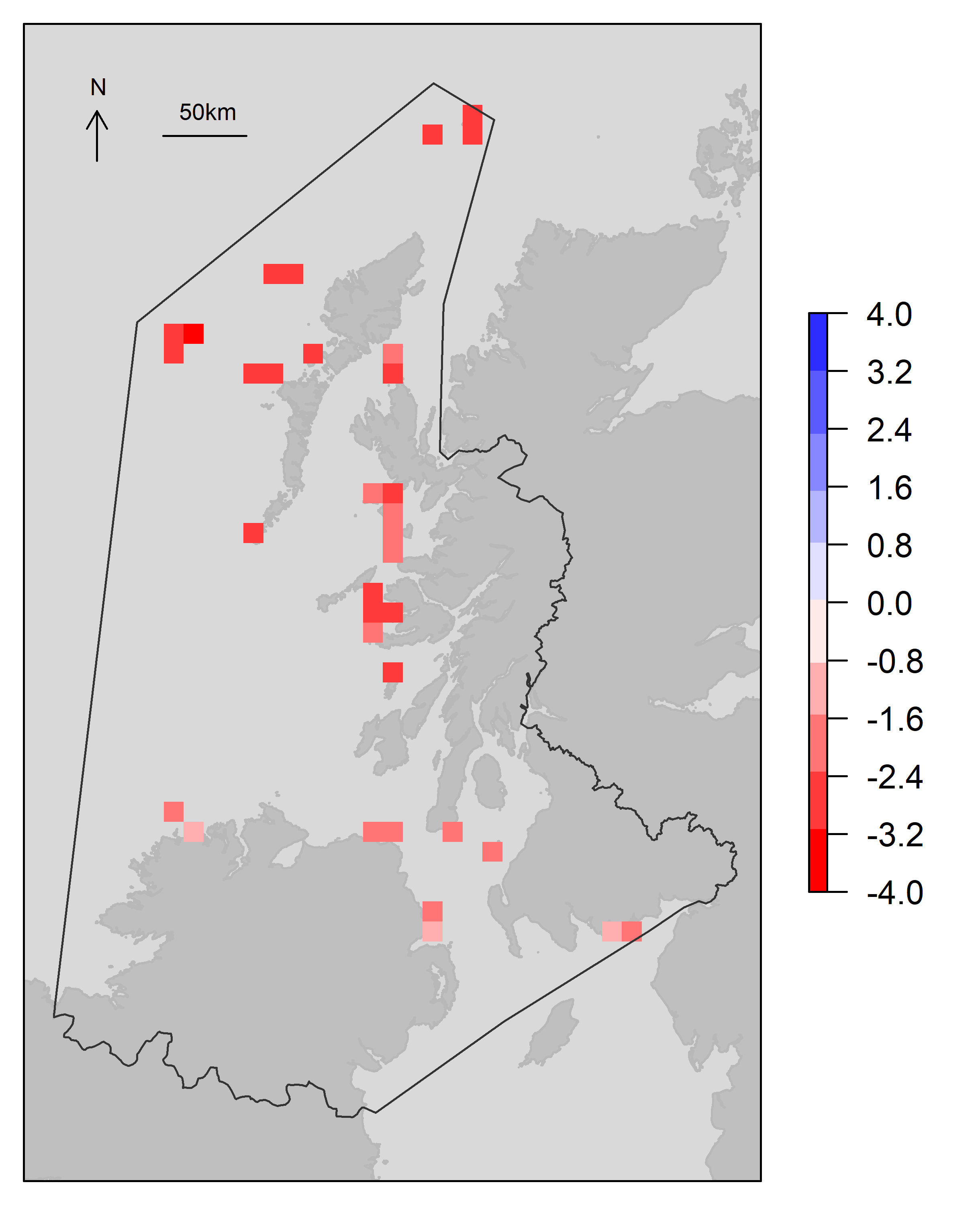 Figure: Projected change (1998-2002 to 2050) in Fulmar breeding pairs, for all areas where Fulmar was present in 1998-2002. Blue = increase, red = decrease. Black polygon = INTERREG VA area