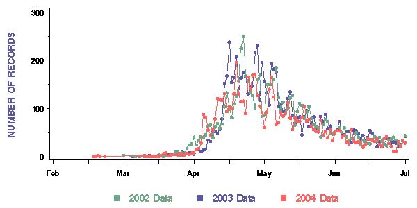 - The number of Swallow records increased while Swallows arrived, but after the main arrival period, the number of records decreased - likely because birdwatchers reduce their recording effort of a species once it has 'arrived'.