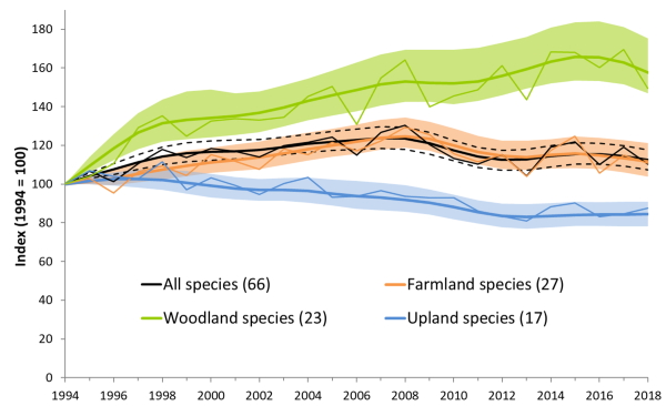 The Wild Bird Indicators are part of the government’s suite of biodiversity indicators, alongside indicators related to measures of habitat condition, air pollution, river water quality, extent of protected areas, spread of non-native species as well as the state of butterflies and other wildlife. The indicators are produced annually for Defra and NatureScot by BTO, together with RSPB and JNCC.