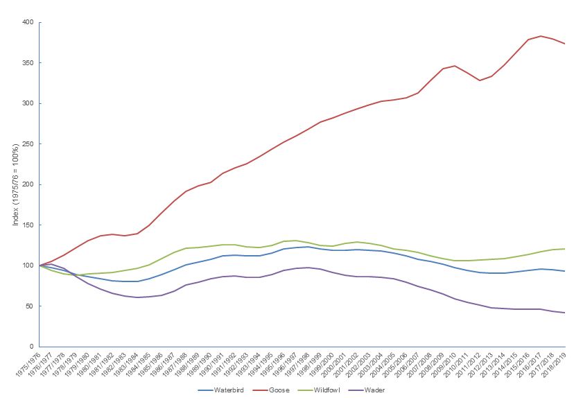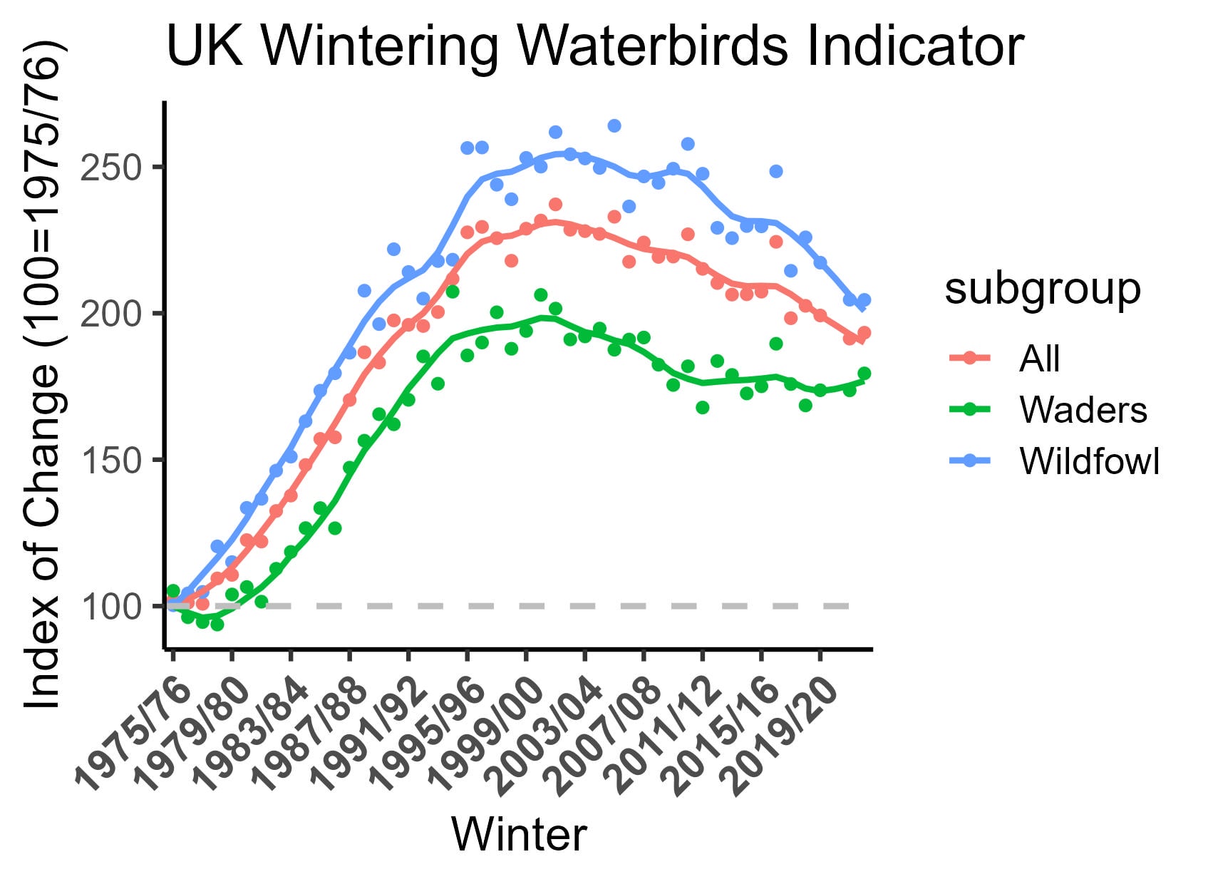 The Wild Bird Indicators are based on population trends of bird species that are native to, and breed or spend the winter in, the UK. These population trends are calculated largely using data that is collected by volunteers, as part of national bird monitoring schemes like the BTO/RSPB/JNCC Wetland Bird Survey and the BTO/JNCC/RSPB Breeding Bird Survey. The indicators therefore link the efforts of our dedicated volunteers directly to a policy-relevant assessment of the state of nature.