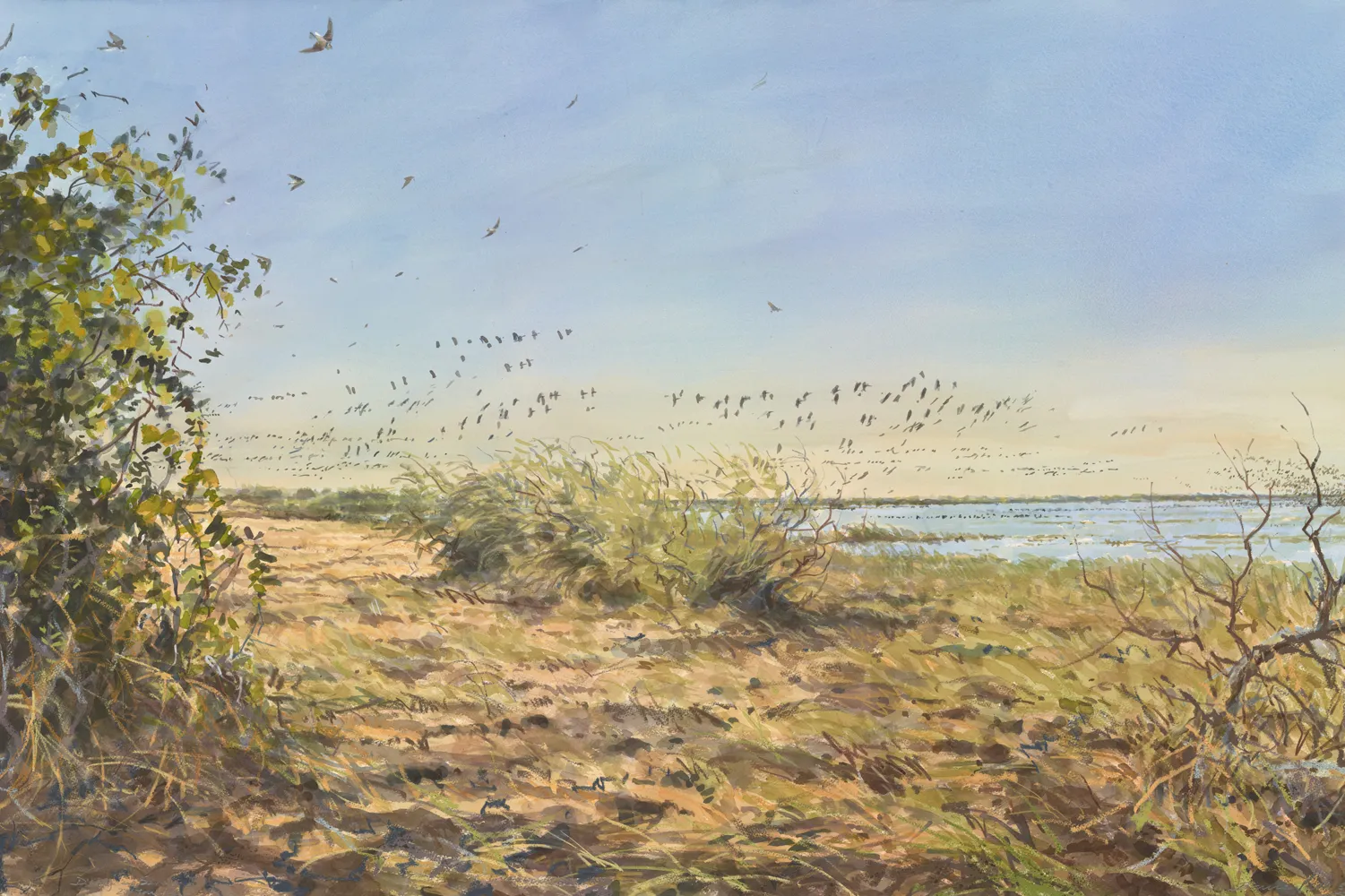 In January 2014, a team of four Society of Wildlife Artists (SWLA) artists accompanied Dr Phil Atkinson, the BTO’s Head of International Research on a trip to Senegal. For the four artists, Robert Greenhalf, Bruce Pearson, Greg Poole and Esther Tyson, this was an opportunity to learn the context behind what they were seeing and sketching. Why did the landscape look the way it did? What were the birds doing and how were changes in these African habitats influencing their populations.