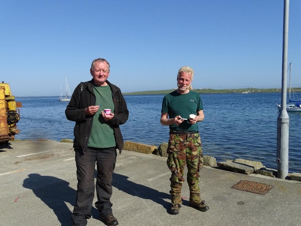 John (left) and David (right) relaxing on the Rousay pier after fieldwork was complete.
