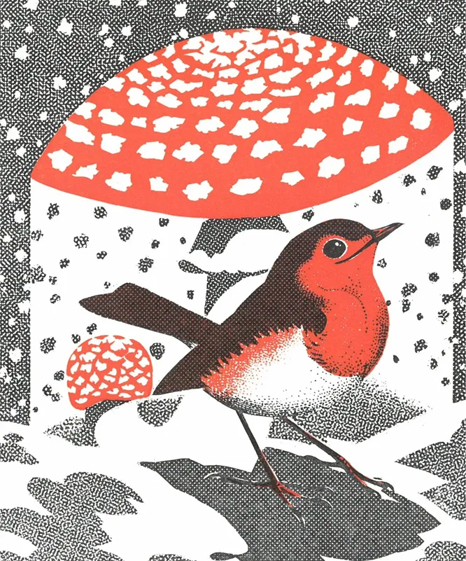 At BTO, we have continued to produce Christmas cards without pause ever since, with at least one new design produced every year. Peter Scott was finally able to produce his second card, a Fulmar, in 1952, and his name is just one of many other well-known artists over the years. Our back catalogue includes paintings from the naturalistic painter Charles Tunnicliffe (1901–1979); the Scottish ornithologist and wildlife artist Donald Watson (1918–2005); the American ornithologist Roger Tory Peterson (1908–1996); and photographs by Eric Hosking (1909–1991); but the creator of the greatest number of BTO Christmas cards by some significant margin is the artist Robert Gillmor (1936–2022), well-known for his distinctive line drawings and linocuts. From his first image, a Redstart, in 1959, he produced the artwork for well over 100 cards over the next almost half a century.