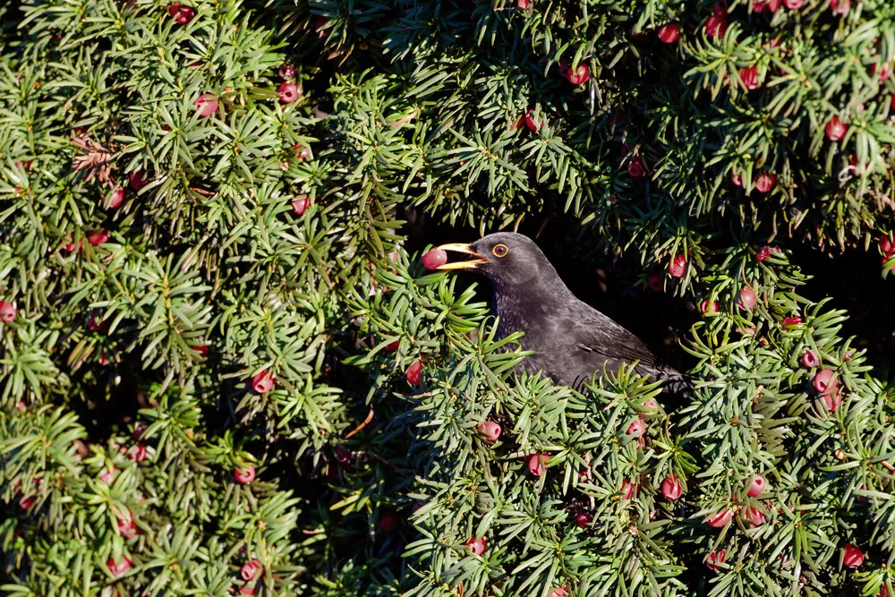 A feast of berries provides energy for the birds, but it also benefits the plant. When birds eat the nutritious, fleshy fruits, they also eat the seeds inside. These seeds have tough external coats that protect them from the birds’ digestive systems, so they pass undamaged through the gut and are deposited elsewhere – with free fertiliser! This enables the plant to disperse its seeds over much greater distances than would otherwise be possible.