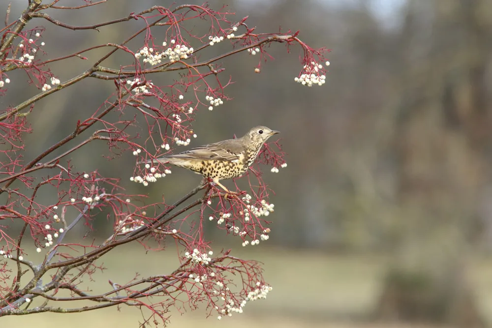 Many ornamental trees and shrubs bear nutritious fruits in autumn and winter, as do the smaller native trees often planted for their autumn leaf and berry colour. The prevalence of trees such as Rowan and Holly in spaces such as parks or even supermarket car parks means that flocks of birds often forage close to human habitation.