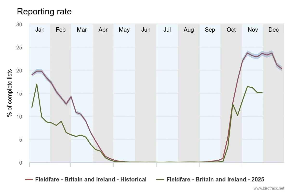 Of the commoner migrants, reports of Woodcock surged in November as migrants from Fennoscandia and Russia arrived here to add to our much smaller resident population. However, the reporting rate for Fieldfare is significantly less than average for the second winter in a row, while Redwing and Brambling are also being reported slightly less frequently than average. Year-to-year fluctuations in the populations of these species wintering in Britain and Ireland are normal, but it may also be that there is a long-term decline linked to climate change. Just as we can say with more confidence about populations of some wintering wildfowl, which are better understood thanks to long-term monitoring through the BTO/RSPB/JNCC Wetland Bird Survey (WeBS). This year’s Winter Bird Survey will hopefully help us better understand the populations of species such as Fieldfare.
