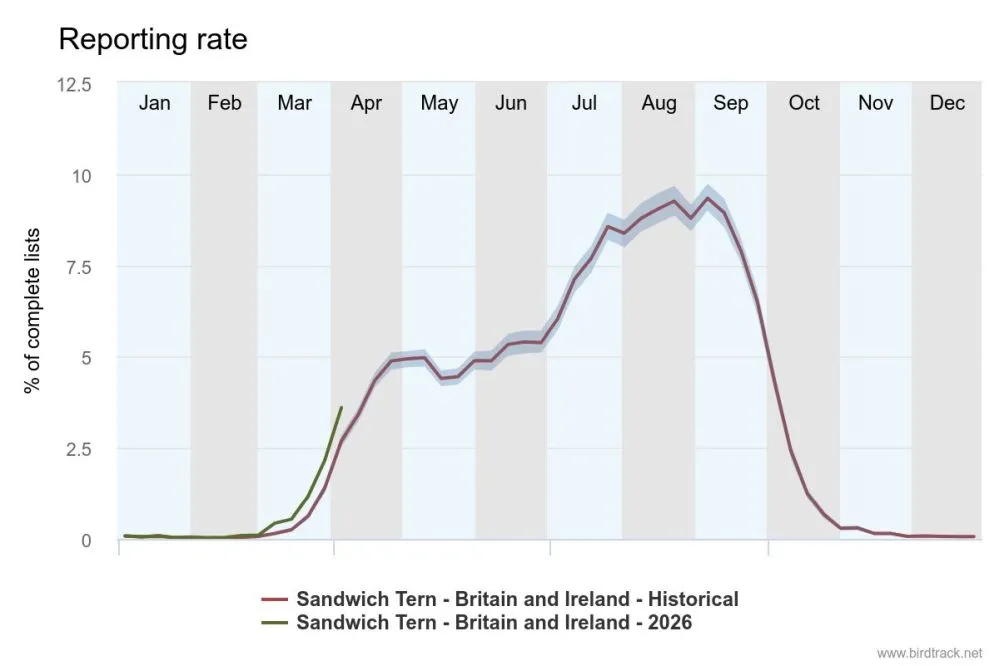 The first Common, Arctic and Little Terns have been reported in recent days, while Sandwich Terns were recorded on 3.6% of Complete Lists in the last week, having been arriving throughout March.