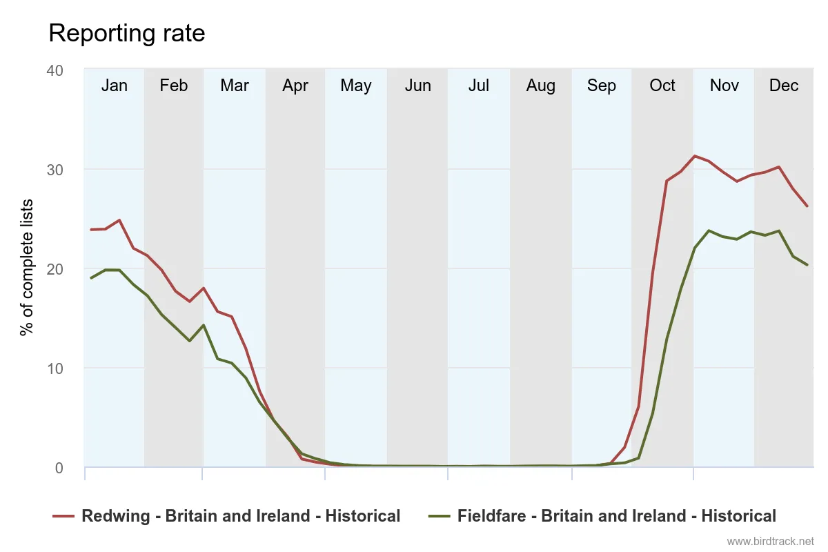 Winter wildfowl coming from the east have not arrived in such numbers yet, for example the reporting rate for Dark-bellied Brent Goose is still a bit behind the average for the time of year, while species like Redwing and Brambling are also running behind schedule. The main arrival of Fieldfare is normally a couple of weeks later than the previously mentioned species, so it’s not too surprising to see very few reports of this claret and blue thrush so far.