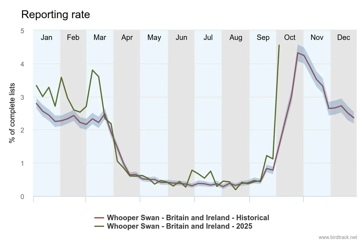 Winter visitors that arrive from Iceland and Greenland have also been on the move in the last week. Whooper Swans have been observed arriving in good numbers, including to wintering sites in the Fens, and this has been reflected in the BirdTrack reporting rate, which has already reached levels we would not typically see until the end of October. Pink-footed Geese have also been arriving en masse, appearing on over 10% of complete lists this week.