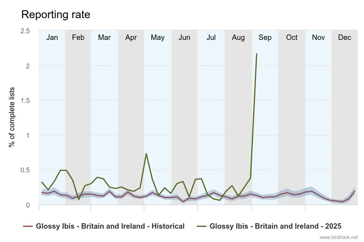 It would be remiss not to mention here the most notable ornithological event of this week, which has been an unprecedented influx of Glossy Ibis to Britain and Ireland, with a minimum of 605 birds recorded on 8 September and more arriving since then. The bigger picture here is that Glossy Ibis is increasingly occurring in Britain, just as similar species like Great White Egret and Cattle Egret have, but factors behind this particular arrival probably include a combination of a successful breeding season, favourable winds and the drying up of wetlands in France and Spain. While most of these birds will probably head south again after a period of exploring, some may overwinter in Britain and Ireland and potentially go on to breed next spring.
