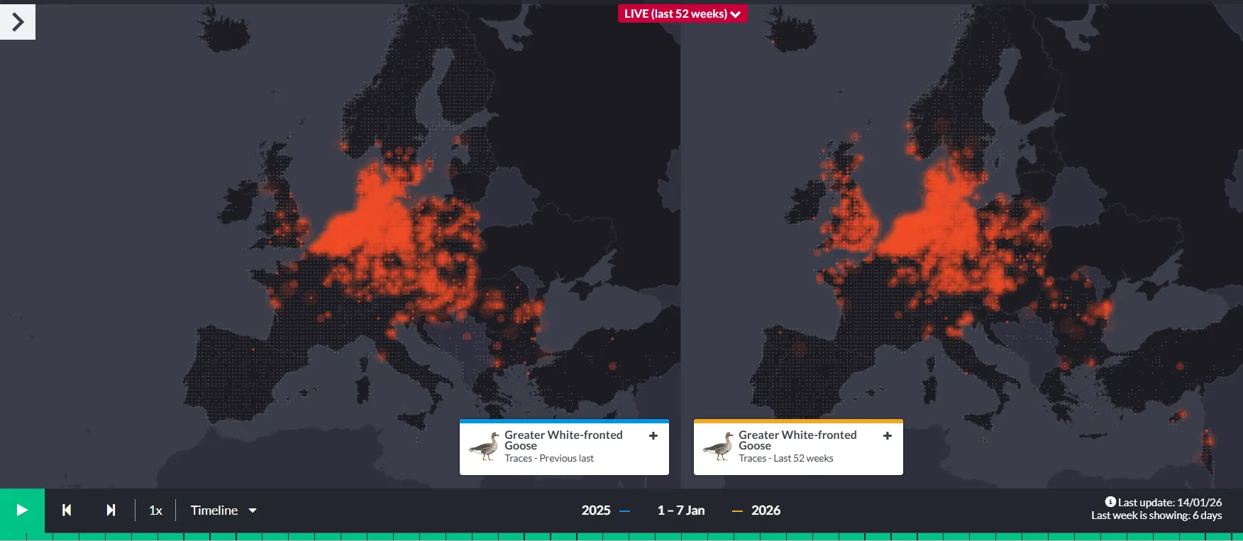 The EuroBirdPortal website, which brings together data from BirdTrack and other bird recording platforms across Europe, does a nice job of illustrating these movements, with reports of White-fronted Geese clearly far more widespread in Britain in the first week of this year than in the same week last year.